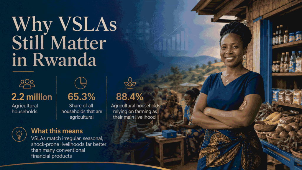 This matters especially in Rwanda’s rural economy. The 2024 Agricultural Household Survey estimates 2.2 million agricultural households, representing 65.3% of all households nationwide, and reports that 88.4% of agricultural households rely on agriculture as their main livelihood activity. In such conditions, a bank account alone does not guarantee resilience. Households need mechanisms that help them save in small amounts, borrow quickly, manage shocks, and maintain social accountability. VSLAs do exactly that.